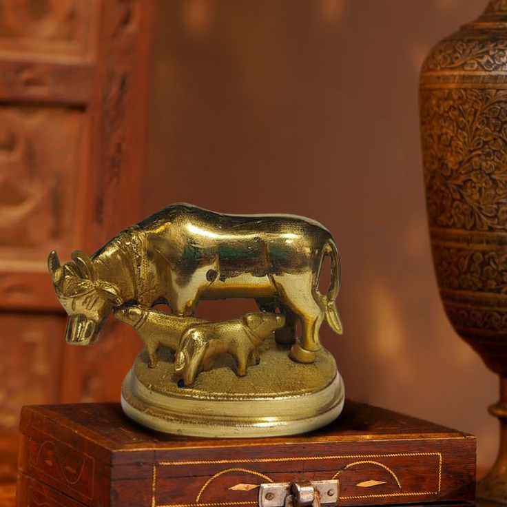 This 3-inch Kamdhenu idol made of pure brass symbolizes purity prosperity and nurturing energy. Intricately designed with traditional detailing it is ideal for home temples pooja spaces or as a thoughtful spiritual gift. Its radiant finish and sacred presence make it a meaningful addition to your devotional collection.